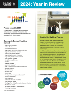 For the past two years we have worked to develop and grow our Building Futures program. Building Futures serves as a resource to help community members receive the services necessary to address their needs. If these needs are addressed the families/individuals are likely to thrive, the community fabric will be strengthened, and systemic inequities decline.