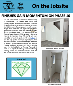 Our first set of homes have entered the finish stage of construction. This month, four homes have finished drywall installation and texture. Esmeralda Drywall, and owner Jaime Ponce, continue to support the Habitat mission by doing expert drywall work at a deeply discounted cost. We appreciate all of their generous support! We have also installed all of the Stone Composite Polymer (SCP) flooring on the first floors of these homes. SPC is a similar, alternative material to Laminate Vinyl Tile (LVT). We were incredibly fortunate to partner with our ReStore to buy this high-quality flooring at a great price. They also sell a few color varieties of flooring in their store in Gypsum. Stop by today to check it out! Maderas Flooring has kindly partnered with the construction team for the installation of flooring. Alan and his team do an expert job installing our homes’ flooring!  Flooring enables our team to move onto finish trim and cabinet installation and painting next month.