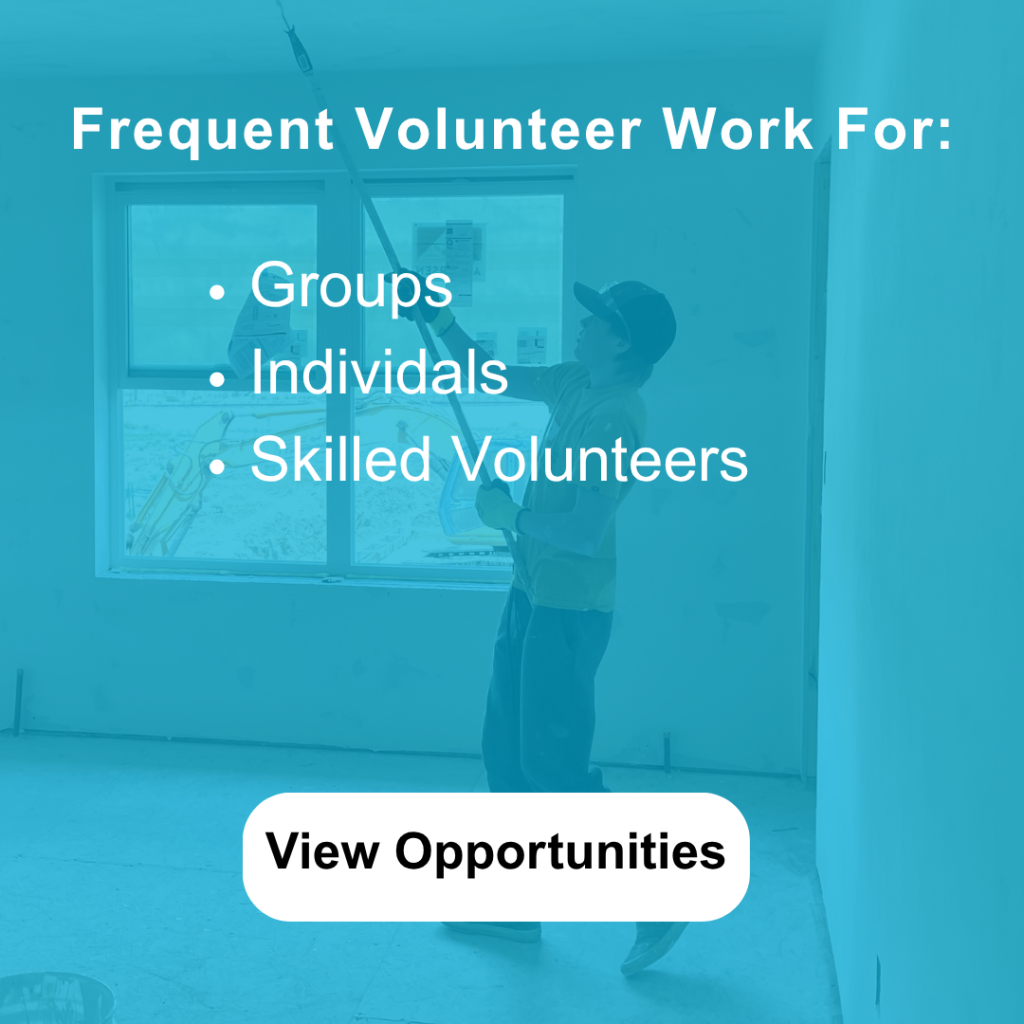 We always welcome volunteers too.  Volunteer jobs include framing, painting, landscaping and so much more. Check out current volunteer opportunties.